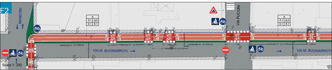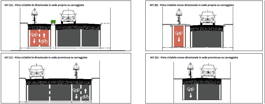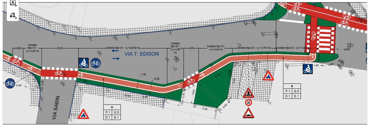 L'intervento in oggetto ha previsto la realizzazione di un univoco percorso ciclabile costituito da differenti tipologie di intervento differenziate in funzione del tessuto urbano attraversato e soprattutto della disponibilità delle sezioni di carreggiata esistenti.