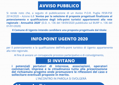Il Comune di Ugento intende candidare una proposta progettuale dal titolo: INFO-POINT UGENTO 2020 per il potenziamento e la qualificazione dell’Info-point turistico di Ugento appartenente alla rete regionale. Al fine di avviare un consapevole processo partecipativo e di coinvolgimento si invitano i potenziali portatori di interesse, associazioni, operatori commerciali, imprese e la cittadinanza tutta alla presentazione del richiamato progetto onde promuovere le riflessioni del caso e sollecitare eventuali proposte in merito.