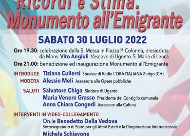 Carissimi Concittadini, con l'obiettivo plurimo di favorire azioni fondate sui principi di libertà, di eguaglianza, di solidarietà e di giustizia, indicati nella Costituzione, di operare al fine di conseguire il pieno sviluppo della propria comunità e di valorizzare il proprio patrimonio sociale e culturale, l'Amministrazione comunale, con Deliberazione n. 276 del 9 dicembre 2021, favoriva l'approvazione di un progetto per la realizzazione di un "MONUMENTO ALL'EMIGRANTE e di completamento dell'arredo urbano su Piazza Pompeo Colonna". Dopo un attento e meticoloso studio sul fenomeno dell' emigrazione che interessò Ugento ed il Mezzogiorno d'Italia fra gli anni '60 e '70, assieme alla locale sezione dell'associazione "Emigranti nel Mondo", si giungeva alla definizione del soggetto monumentale, in un progetto che già si rappresentava per superare la concezione di un'opera pubblica a sé stante e che si candidava ad esser condivisa per Rappresentativita', per Storie e Valori intrinseci, con Autorità Nazionali, Regionali ed Estere, che sin dai primi passi, mossi in tal direzione dal nostro Assessore ai Lavori Pubblici, Alessio MELI, accoglievano con sentimento di riconoscenza ed emozione, garantendo viva partecipazione anche per la prefissata manifestazione inaugurale. Un invito che ci pregiamo estendere all' intera cittadinanza, all'associazionismo locale e ai tantissimi concittadini, che per effetto delle ferie estive, faranno rientro nella nostra meravigliosa terra. [Sindaco Salvatore Chiga]