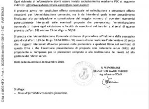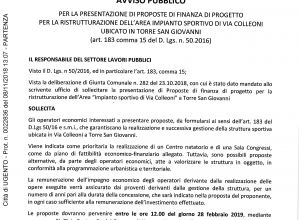 Vista la deliberazione di Giunta Comunale n. 282 del 23.10.2018, con cui è stato dato mandato al Settore Lavori Pubblici di sollecitare la presentazione di Proposte di finanza di progetto per la ristrutturazione dell’Area “Impianto sportivo di Via Colleoni” a Torre San Giovanni