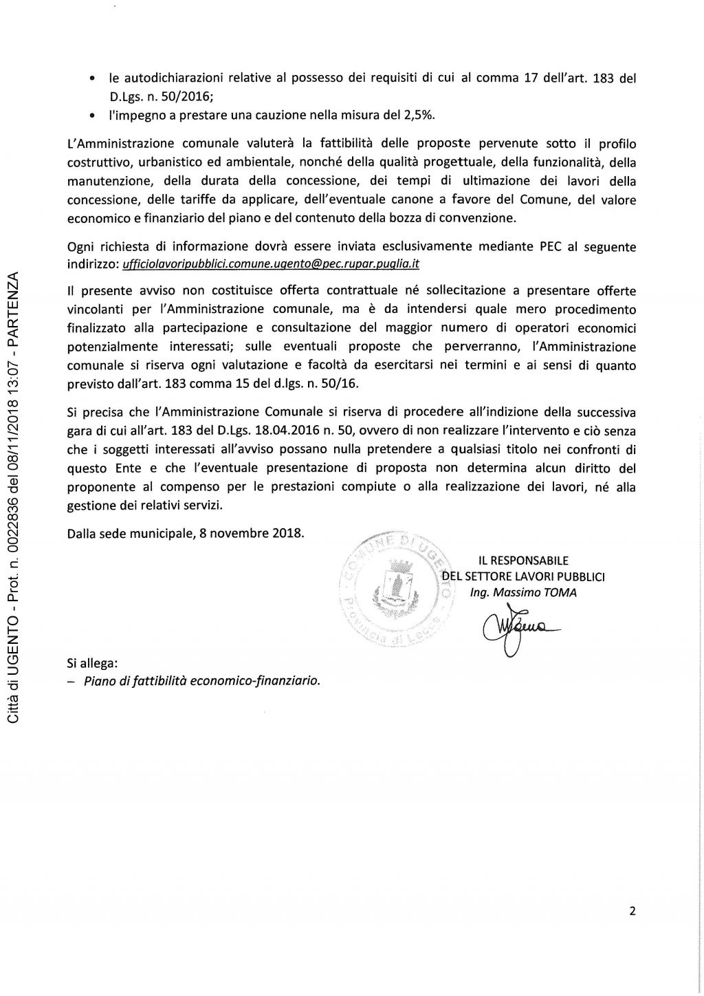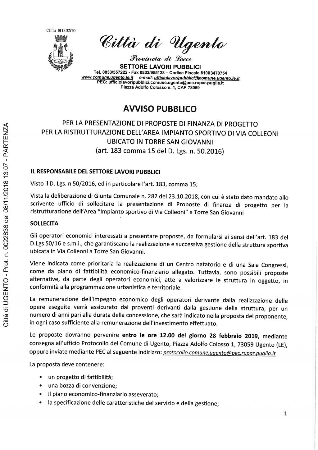 gli operatori economici interessati a presentare proposte, da formularsi ai sensi dell’art. 183 del D.Lgs 50/16 e s.m.i., che garantiscano la realizzazione e successiva gestione della struttura sportiva ubicata in Via Colleoni a Torre San Giovanni.