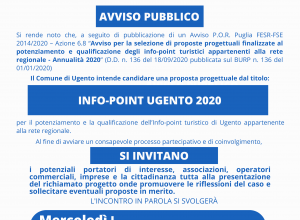 Il Comune di Ugento intende candidare una proposta progettuale dal titolo: INFO-POINT UGENTO 2020 per il potenziamento e la qualificazione dell’Info-point turistico di Ugento appartenente alla rete regionale. Al fine di avviare un consapevole processo partecipativo e di coinvolgimento si invitano i potenziali portatori di interesse, associazioni, operatori commerciali, imprese e la cittadinanza tutta alla presentazione del richiamato progetto onde promuovere le riflessioni del caso e sollecitare eventuali proposte in merito.