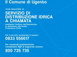 L'AQP informa che il giorno 11 novembre, 2024, a causa di lavori di manutenzione e collegamento, ci sarà l'interruzione del servizo idrico dalle ore 8.00 alle ore 17.00 nell'intero abitato di Ugento, a tal proposito il comune rende disponibile un servizio di distribuzione idrica a chiamata.