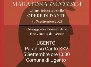 Il Comune di Ugento partecipa alla Maratona Dantesca promossa dal Comune di Andrano, alla quale hanno aderito i Comuni della provincia insieme a tante Associazioni e moltissimi lettori.
