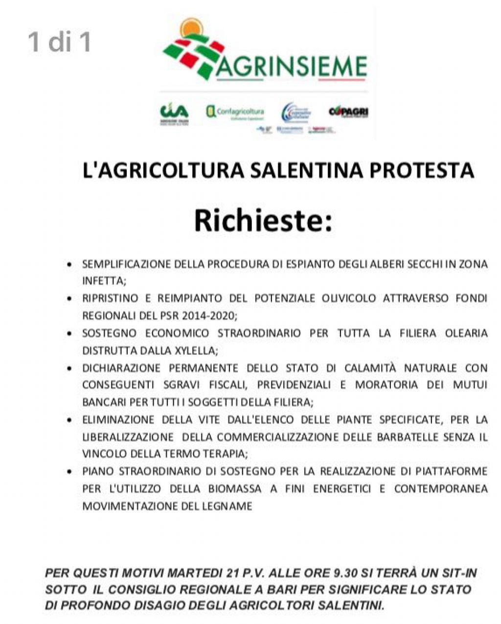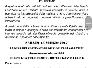 SABATO 18 MARZO 2017 - ORE 9,30 - RADUNO DEI COLTIVATORI OLIVICOLTORI SALENTINI PRESSO L'EX FORO BOARIO - HOTEL TIZIANO - LECCE