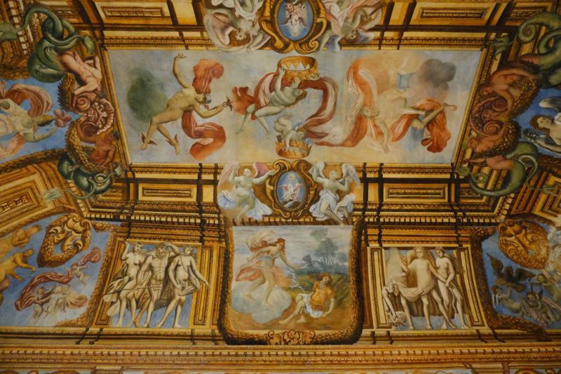 C’è inoltre da sottolineare che l’iconografia degli affreschi si basa, specie nel cosiddetto “Salone Antico” sulle ‘Metamorfosi’ di Ovidio. Si tratta di parabole che illustrano il beneficio di contrarre un buon matrimonio e proteggere il patrimonio di famiglia.